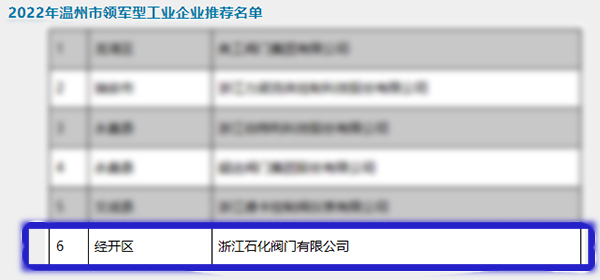 其中,浙江石化閥門有限公司榮獲2022年溫州市領(lǐng)軍型工業(yè)企業(yè)。