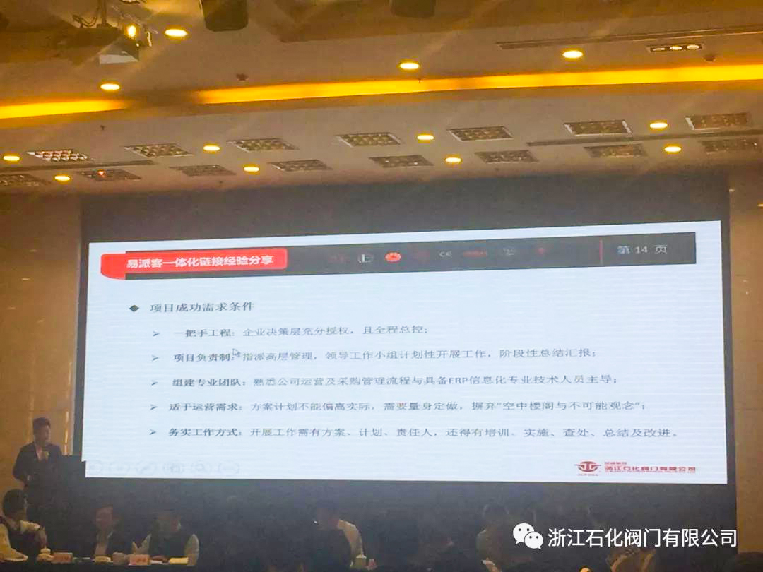 作為最早進(jìn)入易派客平臺(tái)的閥門企業(yè),浙江石化閥門積極響應(yīng)中石化推進(jìn)基于互聯(lián)網(wǎng)+的供應(yīng)鏈管理創(chuàng)新要求,從采購、銷售等環(huán)節(jié)和中石化易派客進(jìn)行了深度的合作,從而使公司的ERP和易派客能夠互聯(lián)互通。會(huì)上公司被邀請(qǐng)分享了易派客一體化連接經(jīng)驗(yàn)。